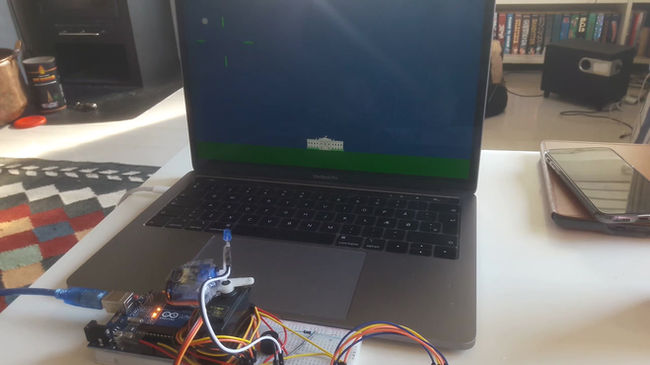 Arcade style game where you steer a lazer cannon placed in front of your laptop, and shoot down missiles that are approaching the White House. Built with Arduino and Processing.